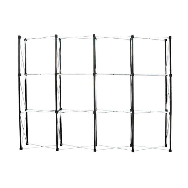 When assembled, PopUp 4x3 Straight Double-Sided has a straight shape and a length of 370cm. PopUp display 4x3 straight consists of a lightweight, extensible, and stable metallic structure spider type and the magnetic strips attached to the graphic that help fitting it to the structure. The system includes 1 extensible structure configured as a matrix on 4 columns and 3 rows, 30 metallic rods, 1 spotlight and 1 wheeled rigid bag for protection and easy transportation.