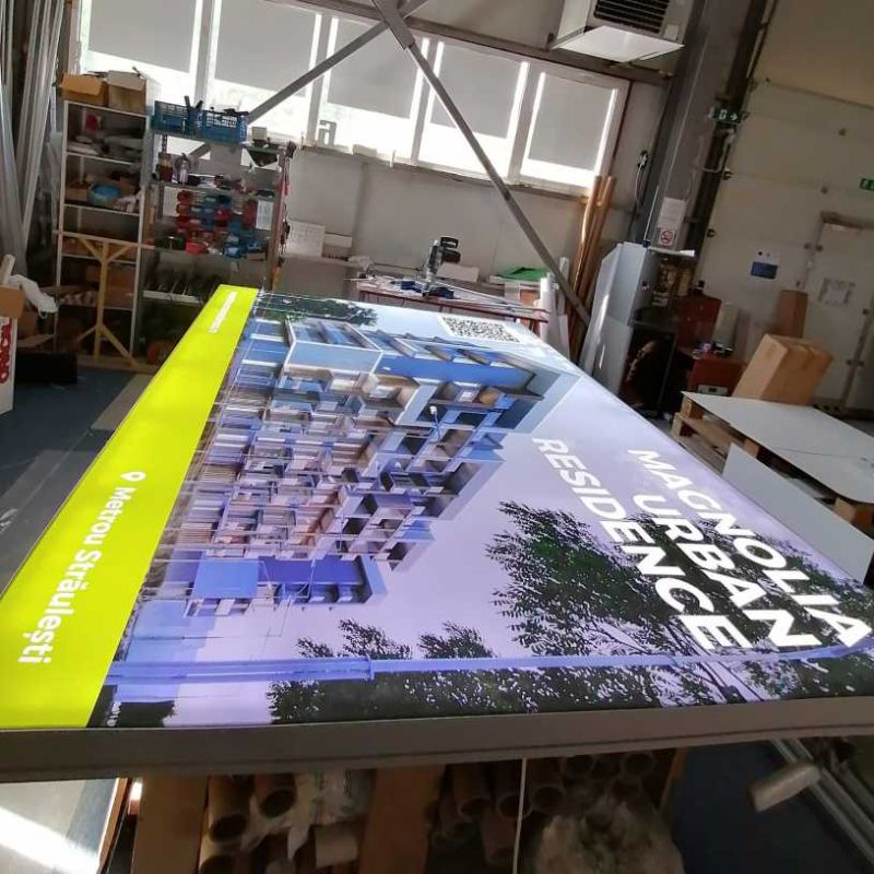 The high-quality textile material is printed on backlit fabric (which allows light passing) using the latest generation latex printer or by sublimation. It has vivid colors and is water-resistant. The print is provided with a silicone stripe on the edge that is mounted on the perimeter of the frame, ensuring the perfect tension of the textile material. The installation, replacing, or exchanging the textile prints can be easily done by any person, without special tools or knowledge.