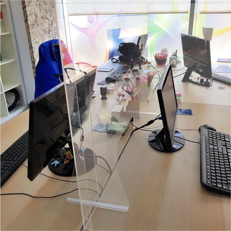 The Acrylic Desk Divider is used to create a protector screen against the spread of germs and viruses. It is suitable for open workspaces, where multiple desks are adjacent or are grouped together. The Acrylic Desk Divider is positioned between the offices to ensure the needed sanitary protection.