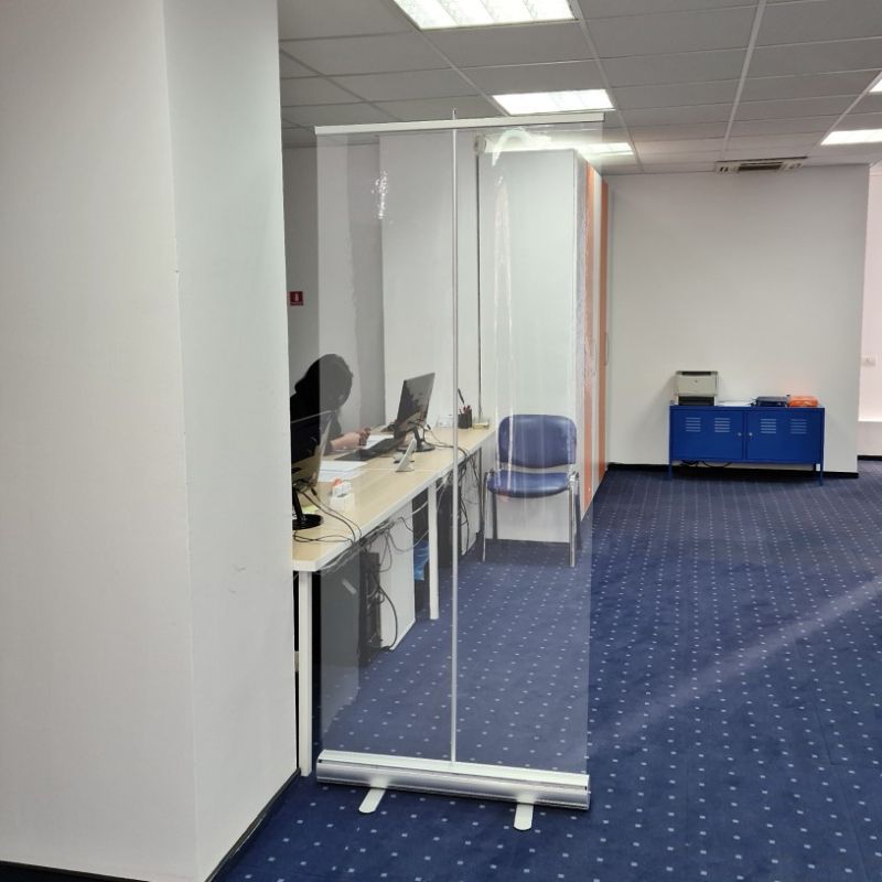 The RollUp Banner Office Partition is made from a RollUp system provided with a transparent and flexible panel with sizes of 85 / 100 / 120 / 150 x 200 cm. Using a transparent material, the panel does not block visibility, and colleagues can see each other and communicate easily, being protected at the same time.