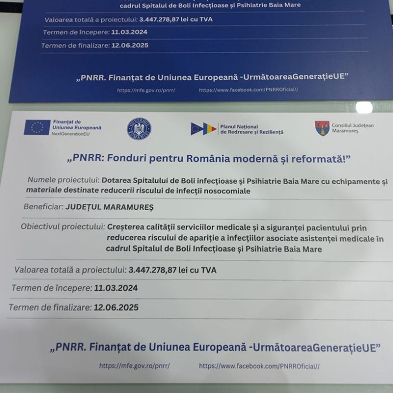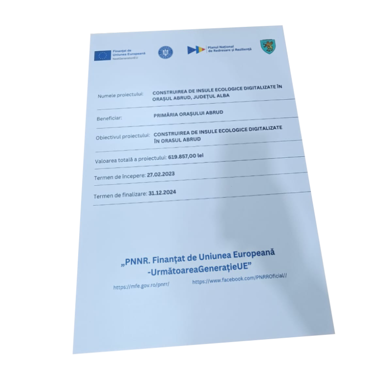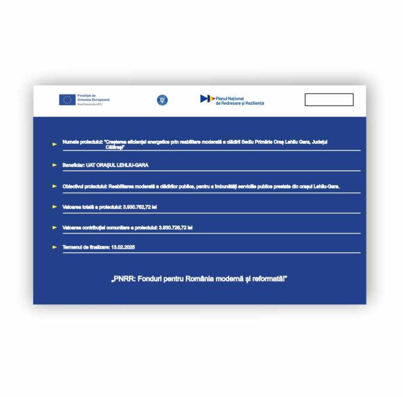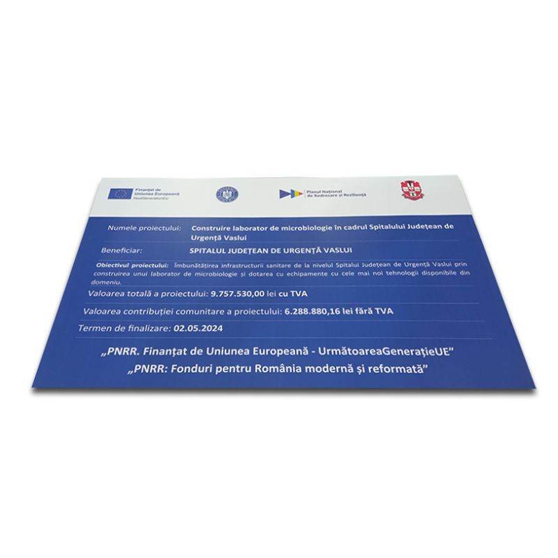 Information Billboard for PNRR European projects - National Recovery and Resilience Plan, which is made for outdoor display of the project information. It is made of a 3 mm thick bond / alucubond and is customized with the data of the beneficiary's project, according to the requirements of the Visual Identity Manual. It can be made both as a temporary and permanent billboard; needed during the implementation of the project and at least 2 years after. The information billboard