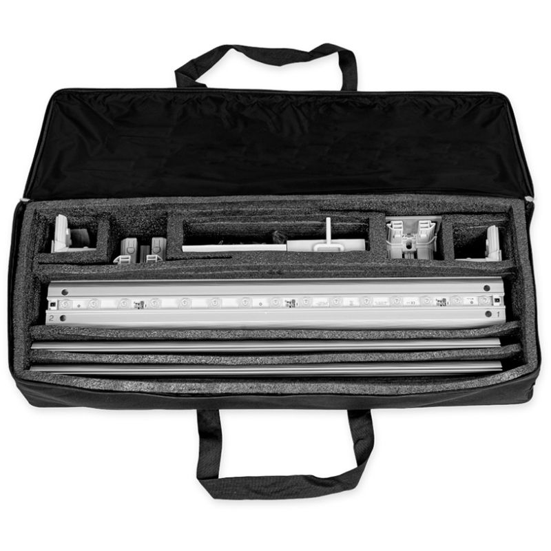 Description: The LUMIX Textile Desk 100 is a sophisticated portable counter designed for professional indoor presentations at fairs, exhibitions, and corporate events. The system features a rectangular frame constructed from sturdy, 12 cm wide "frameless" aluminum profiles, which ensures structural integrity while maintaining a sleek, modern aesthetic. The top of the counter is finished with a durable black wooden countertop (100x35 cm), providing a functional surface for interactions. Illumination is a defining feature of this desk, provided by a specialized lighting system consisting of 16 LED modules. These modules emit a cold white light that uniformly illuminates the graphics from within, ensuring high visibility. The visual presentation uses high-quality textile prints on both sides, produced at a 1440 dpi resolution with environmentally friendly, odorless, and solvent-free inks. These graphics feature silicone stripes sewn into the top and bottom edges, which insert effortlessly into the frame's channels for a smooth, tensioned display.