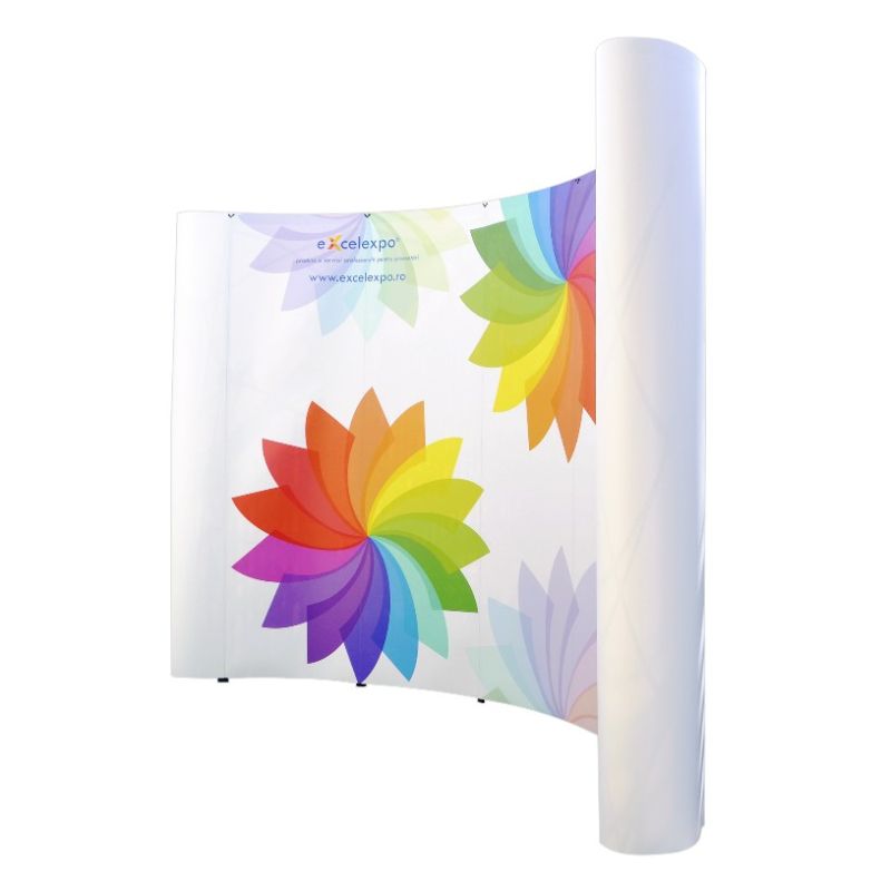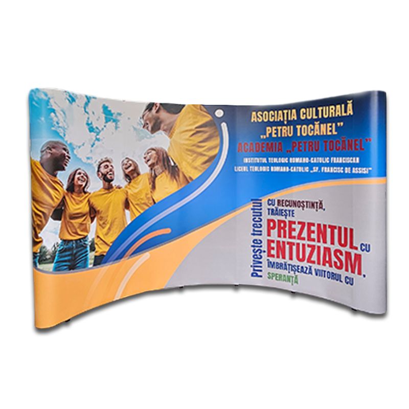 | Description: PopUp Banner Display stands are large portable display systems for indoor with a professional look specially designed for the exhibitions, presentations, conferences, conventions, and product launches. When assembled, PopUp 5x3 Curved has a slightly curved front and a length of 390cm. Pop-up display 5x3 curved consists of a lightweight, extensible and stable metallic structure spider type and the magnetic strips attached to the graphic that help fitting it to the structure. The system includes an extensible structure configured as a matrix on 5 columns and 3 rows, 24 metallic rods, 1 spotlight and 1 wheeled rigid bag for protection and easy transportation. The graphic consists of 7 panels (5 in the center and 2 on the sides) made of 0.4mm PVC customized with printed and laminated self-adhesive vinyl. The graphic is printed at a resolution of 2400 dpi using professional equipment of the latest generation and environmentally friendly inks, odorless and solvent-free. The graphic is covered by a laminated foil for extra protection. In the "Instructions" tab you will find Graphic specifications and Assembly instructions. |