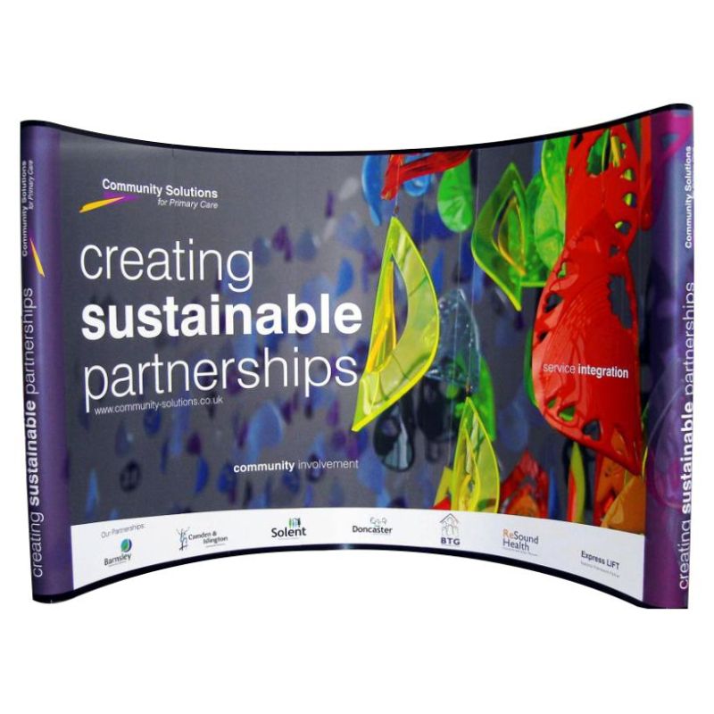 | Advantages: Pop-Up 5x3 Curved system is a professional system that provides a generous printed area of 484x230cm while ensuring a quick and easy mounting and dismounting. The advantages of PopUp Banner Displays are large display area of the graphic, the quick installation without any tools (about 10 minutes), high portability (the disassembled stand fits into a bag of 45x45x90cm), the small area required for storage, the spotlight for highlighting the logo and the rigid bag with wheels included in the price of the system. The graphic can be changed at any time thus achieving a new customized visual. Multiple sets of graphics can be ordered for alternate use. |