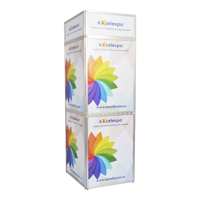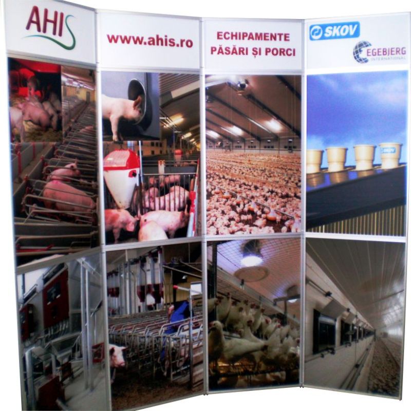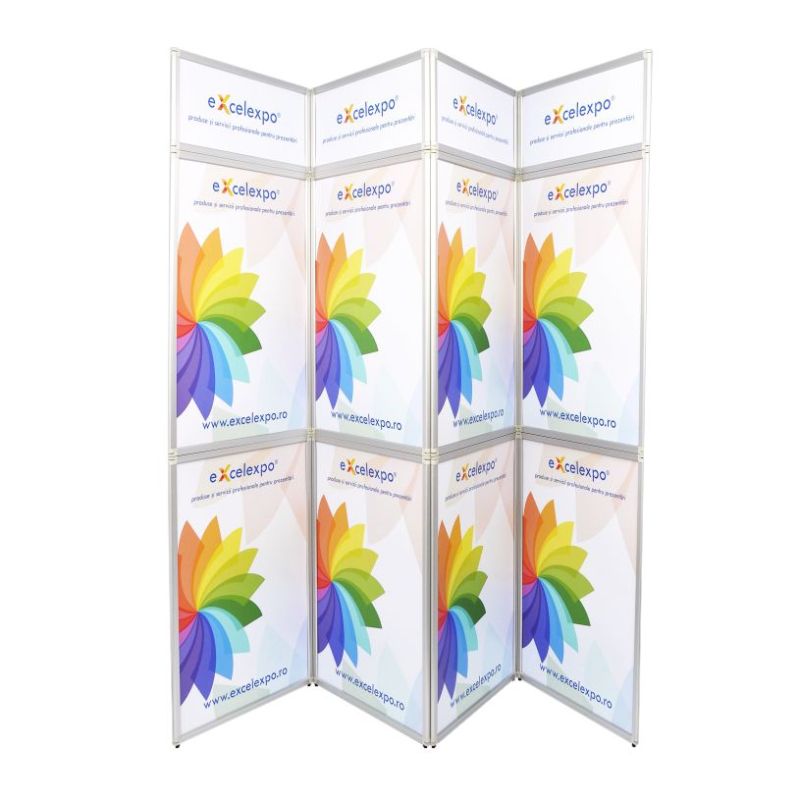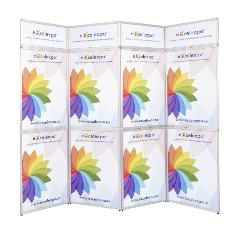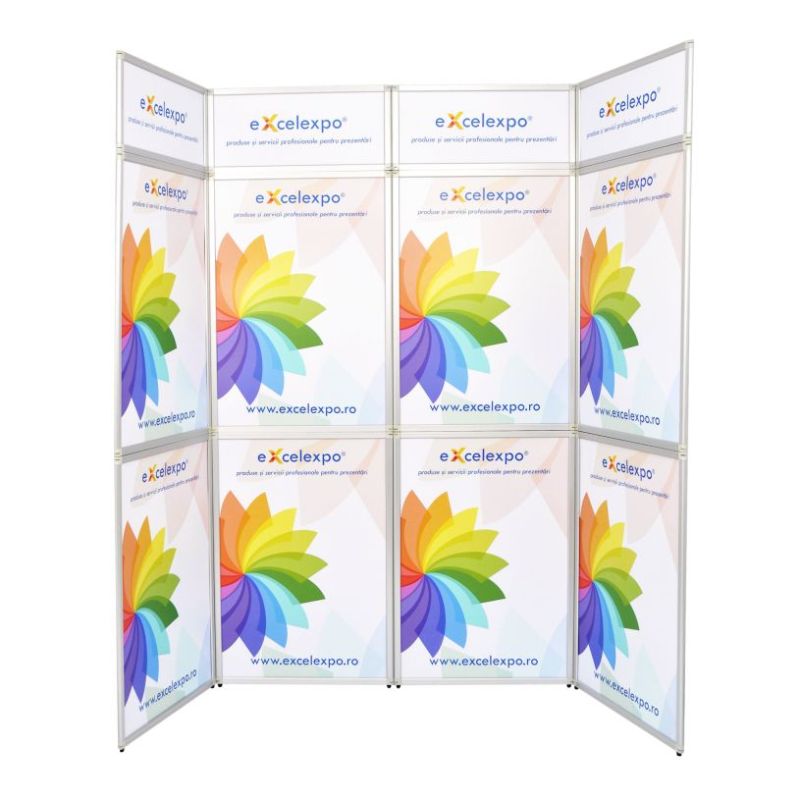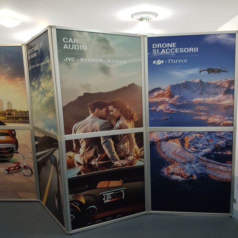 | Prezentare: Flexiframe 280x230 este un perete de prezentare creat special pentru utilizare in cadrul expozitiilor, prezentarilor, conferintelor. Este utilizat pentru prezentarea informatiilor despre produs, companie dar poate fi utilizat si pentru separarea si amenajarea spatiului de expunere. Sistemul Flexiframe este format din 12 cadre de aluminiu (8 cu dimensiunea de 70x100cm si 4 cu dimensiunea de 70x30cm), ce contin fiecare cate o placa rigida de 4mm personalizata cu autocolant printat in policromie si laminat. Cadrele sunt prinse intre ele prin intermediul unor balamale rabatabile la 360 grade ce permit modelarea sistemului in diverse forme si configuratii. Se pot crea turnuri care sa mascheze stalpi sau poate fi folosit ca fundal neregulat pentru spatiul expozitional. Grosimea fiecarei rame de aluminiu este de 2,5cm. In tabul "Instructiuni" gasiti Instructiuni realizare macheta. |