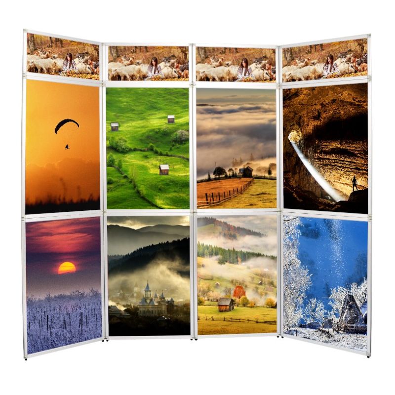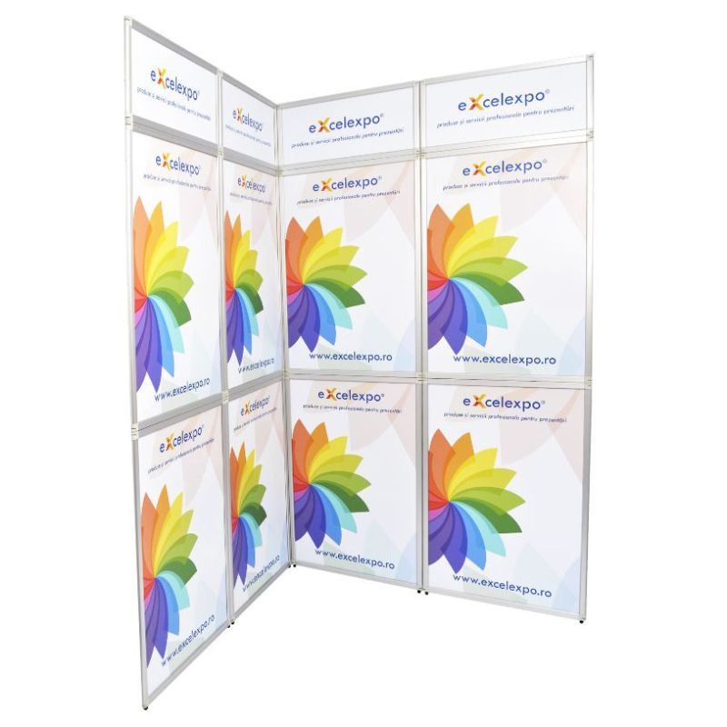 | Avantaje: Sistemul Flexiframe 280x230 expune o suprafata de prezentare foarte mare de 280x230cm in conditiile unei montari si demontari usoare si rapide. Principalele avantaje ale standului sunt: sistem demontabil, suprafata de expunere mare, portabilitatea ridicata (demontat ocupa spatiu mic), posibilitatea de a realiza diverse compartimentari, libertate in alegerea formei suprafetei de expunere, etc. |